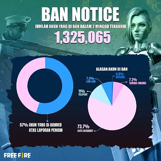 Tentunya jika benar ketahuan menggunakan cheat, hukuman ban permanen sudah di depan mata. Pada pekan pertama bulan April lalu, Garena telah ‘menghanguskan’ 1.325.065 akun cheater Free Fire yang terdeteksi sistem keamanan Garena.