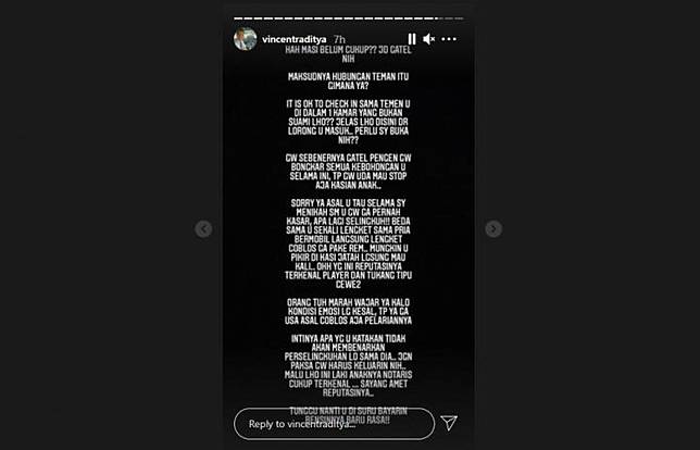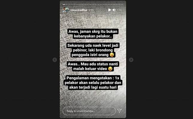 "Awas, zaman sekarang itu bukan kebanyakan pelakor. Sekarang sudah naik level jadi pebinor, laki brondong penggoda istri orang. Awas. Mau adu status nanti malah keluar video. Pengalamn mengatakan: satu kali pelakor akan selalu pelakor dan akan terjadi lagi suatu hari," demikian unggahan Kapten Vincent lewat Instastory-nya.