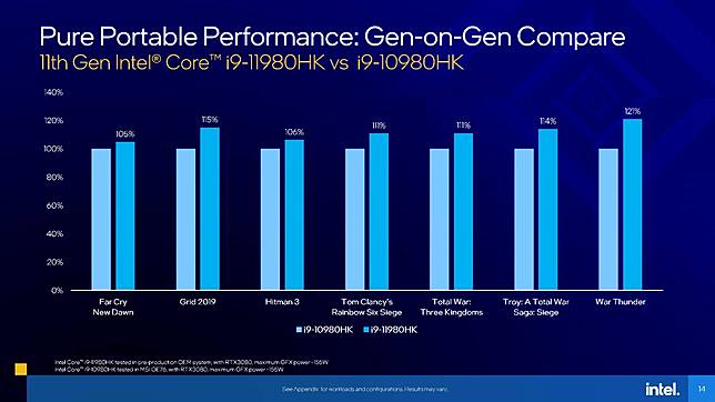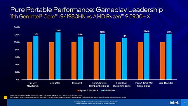 Perbandingan performa ini diperlihatkan lewat pengalaman bermain sejumlah game. Intel Core i9-11980HK dibandingkan pendahulunya yaitu i9-10980HK dari keluarga Intel Core Generasi ke-10 menunjukan peningkatan performa hingga 19 persen.